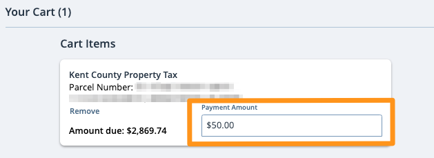 Kent County Property Tax bills can be paid in full or in part on myKentCounty. As you go through the process of making your payment (see Pay a Delinquent Property Tax Bill on myKentCounty), you will be prompted to add the property to your cart and checkout.