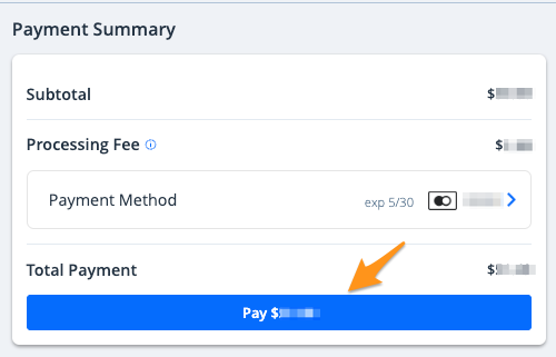 3. Select a payment method or add a new payment method. Then click the blue Pay $--.-- button to complete your payment.