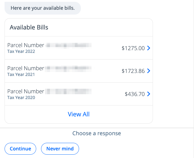 4. Available bills and bill amounts will appear. You may click on the blue arrow next to the bill amounts to view additional bill information. You can pay a bill by clicking Continue. You can also return to the Dashboard by clicking Never mind.